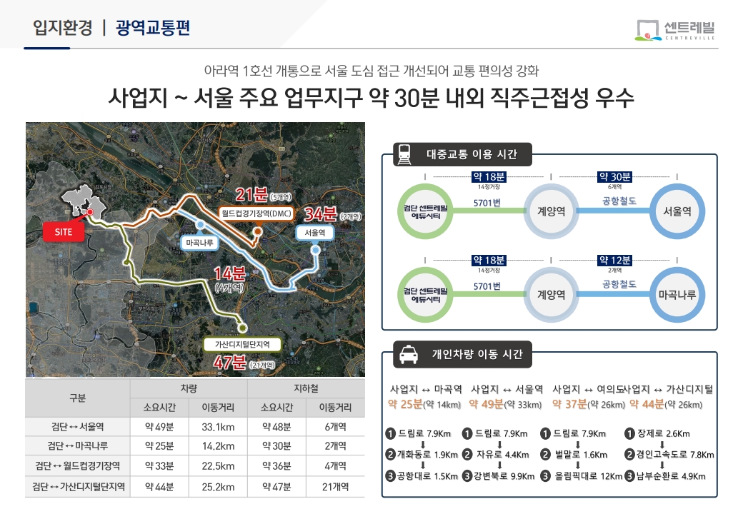 철도 교통은 최근 변화가 컸습니다. 인천지하철 1호선 검단 연장선 구간이 개통되면서, 검단호수공원역·신검단중앙역·아라역 등 3개 역이 새로 문을 열었습니다. 검단 센트레빌 에듀시티는 이 가운데 아라역 생활권에 해당하는 입지로, 역 이용이 편리한 검단신도시 아파트로 평가됩니다.