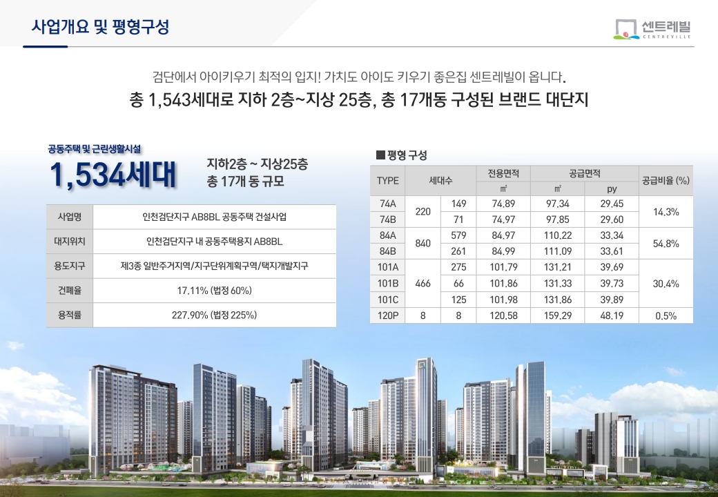 지금까지 검단 센트레빌 에듀시티의 핵심 정보를 정리해 보았습니다. 이 단지는 인천 검단신도시 AB8블록에 들어서는 1,534세대 규모의 대단지로, 전용 74~120㎡ 다양한 평형 구성, 검단 연장선 아라역 생활권, 학세권·생활 인프라·조경·커뮤니티 특화 등 여러 요소를 갖춘 검단신도시 아파트입니다.