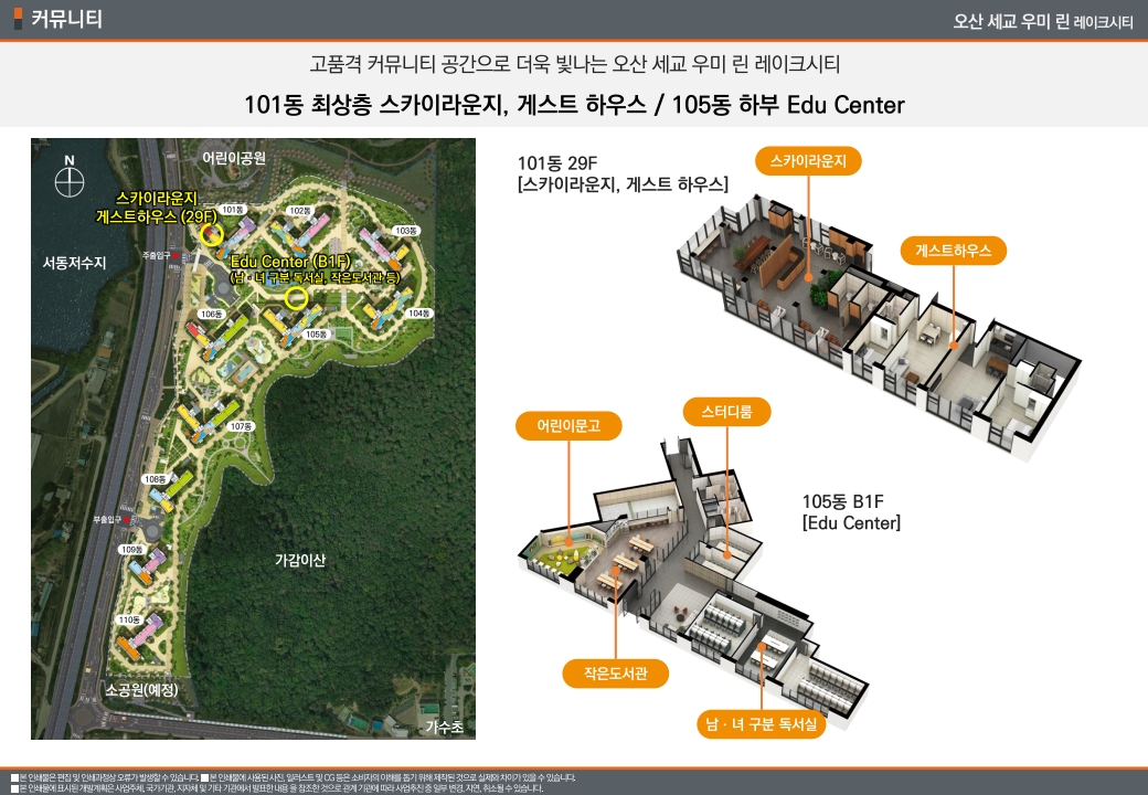 커뮤니티 시설 구성도 나쁘지 않습니다. 유아 전용 풀장이 있는 실내 수영장, 29층 최상층에 조성되는 스카이라운지가 대표적인데, 특히 스카이라운지에서는 서동저수지 전망을 감상할 수 있다고 합니다. 실내 골프연습장, 헬스장, 탁구장 같은 기본 시설 외에도 독서실과 스터디룸을 별도로 마련한 점이 눈에 띕니다. 아무래도 자녀 교육에 관심 있는 가정들을 타겟으로 한 구성이 아닌가 싶습니다.