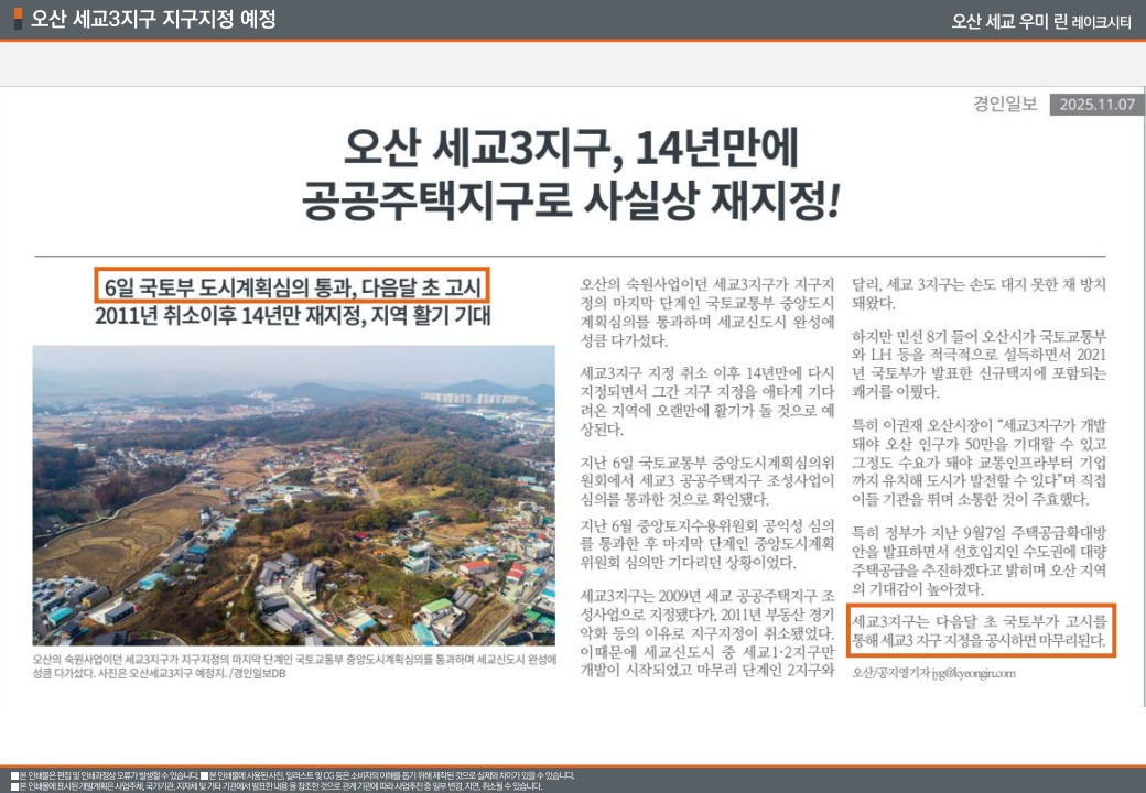 그리고 가장 중요한 세교3지구 이야기를 해야 합니다. 올해 11월 6일, 국토부 중앙도시계획위원회 심의를 통과하면서 14년간 표류하던 이 사업이 드디어 본격화되었습니다. 2009년에 지정됐다가 2011년 부동산 경기 악화로 취소되었던 아픈 역사가 있는 곳인데, 이번에 재지정되면서 지역 전체에 활기가 돌고 있습니다.