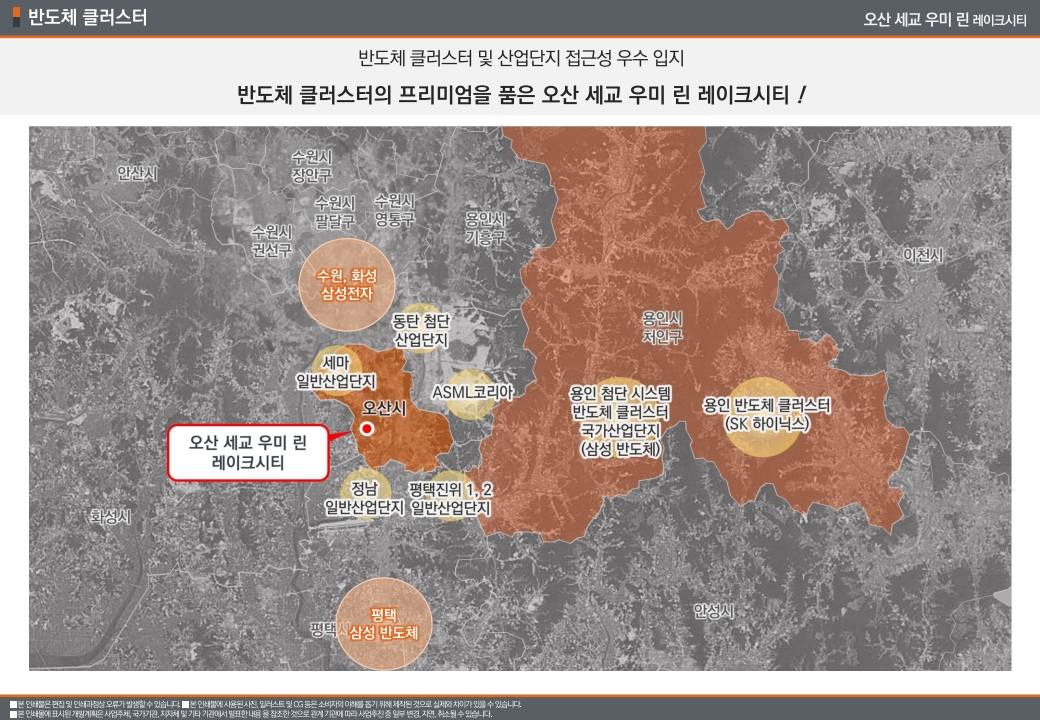 직장인들이라면 출퇴근 거리도 무시 못 합니다. 이 지역은 직주근접 측면에서도 상당히 유리합니다. 인근에 가장1·2·3일반산업단지, 정남일반산업단지가 있고, 차로 20~30분 거리에 삼성전자 화성사업장, 평택캠퍼스, 수원 디지털시티가 있습니다. 특히 세교3지구가 수도권 반도체 클러스터의 배후 주거지로 개발되면서, 반도체 관련 기업 종사자들의 수요가 집중될 것으로 예상됩니다. 실제로 글로벌 반도체 장비 기업인 램리서치, 어플라이드 머티어리얼즈 같은 회사들도 오산에 연구개발센터를 설립하고 있습니다.