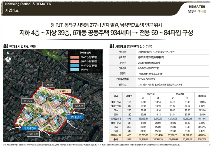 프로젝트 규모를 보면 지하 4층에서 지상 39층까지 총 6개 동, 934세대로 계획되어 있습니다. 중소형 위주로 구성되는데, 전용 59제곱미터가 478세대, 84제곱미터가 456세대입니다. 요즘 같은 시대에 대형 평수보다는 관리하기 편한 중소형을 선호하는 추세를 잘 반영한 구성이라고 볼 수 있습니다.