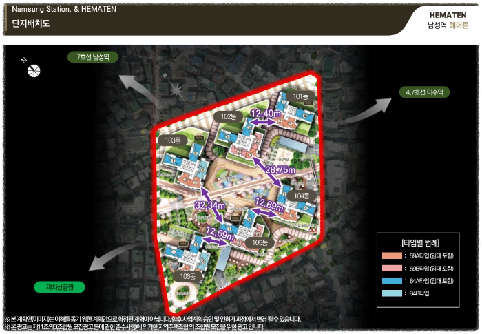 남성역 헤머튼은 전 세대가 남향 중심으로 배치되어 있다고 합니다. 동간 거리도 넉넉하게 확보해서 채광과 환기가 좋을 것으로 기대됩니다. 최근 아파트들이 빼곡하게 들어서는 경우가 많은데, 개방감과 조망을 신경 쓴 설계라는 점이 눈에 띕니다. 마감재도 고급 자재를 사용하고, 드레스룸 공간도 여유 있게 계획했다고 하네요.