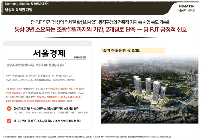 남성역 헤머튼은 지역주택조합 방식으로 진행되는 프로젝트입니다. 일반 분양 아파트보다 가격 경쟁력이 있다는 게 가장 큰 장점이죠. 동작구는 서울 내에서도 지역주택조합 사업이 활발한 곳으로 유명합니다. 실제로 올해 5월 기준 동작구에서 착공까지 성공한 지주택 사업장이 12곳이나 되고, 이들 단지의 입주 후 가격 상승세도 뚜렷하다고 합니다.