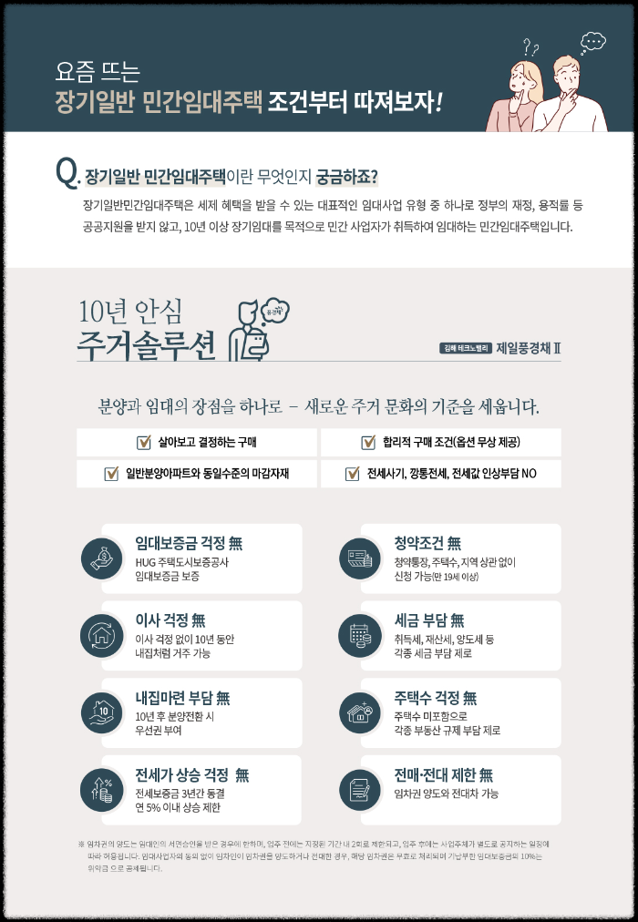 많은 분들이 장기 민간임대를 그저 기간이 긴 전세 정도로 여기는 경향이 있습니다. 사실 저도 처음엔 그랬습니다. 하지만 자세히 알아보니 완전히 다른 개념이더군요. 김해 테크노밸리 제일풍경채 2차는 최장 10년간 거주 보장은 물론이고, 보유 주택 수에도 들어가지 않습니다. 그러니까 이미 집이 있는 분들도 양도소득세나 취득세 걱정 없이 신청할 수 있다는 뜻입니다. 더 놀라운 건 청약 자격입니다. 만 19세만 넘으면 전국 어디서든, 청약통장 유무와 관계없이 누구나 지원 가능합니다. 주택도시보증공사 보증까지 가입되어 있어 임대보증금 안전성도 확실하고, 해마다 오르는 임대료도 5% 안쪽으로 제한되어 있습니다. 10년이 지나면 분양 전환 우선권을 받을 수 있으니, 충분히 살아보고 구매 여부를 천천히 판단할 수 있는 셈이죠.