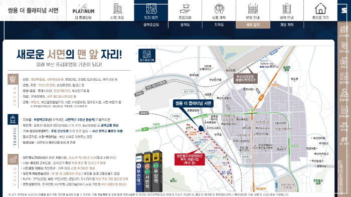 시공사인 쌍용건설은 해외 고급건축 부문에서 국내 1위 실적을 보유하고 있다. 싱가포르 등 해외 현장에서도 품질과 안전성을 인정받은 건설사다. 서면에는 더 플래티넘 브랜드를 처음 선보이는 만큼 완성도에 각별히 신경 쓰고 있다고 한다. 외관은 커튼월룩 마감을 적용해 고급스러운 이미지를 연출했고, 48층 높이의 준초고층 설계로 부산진구 스카이라인에 새로운 이정표를 세울 계획이다.