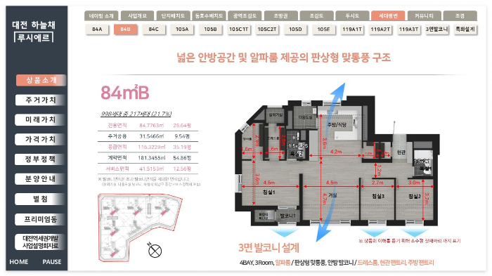 설계 부분을 들여다보면 대전 하늘채 루시에르 2차는 최신 주상복합 트렌드를 충실히 반영했습니다. 층고를 2.4m로 높여 답답함 없는 개방감을 제공하고, 3면 발코니 구조로 채광과 환기를 극대화했습니다. 층간소음을 줄이기 위한 완충재도 설치되며, 드레스룸과 팬트리 같은 수납공간도 타입별로 넉넉하게 배치했다고 하네요. 공용 시설로는 스카이라운지, 무비살롱, 퍼스널 스파 등 특화된 공간부터 피트니스센터, 사우나, GX룸, 골프연습장, 실내체육관, 게스트하우스까지 다채롭게 준비되어 있어 입주 후 생활의 질이 상당히 높아질 것 같습니다.