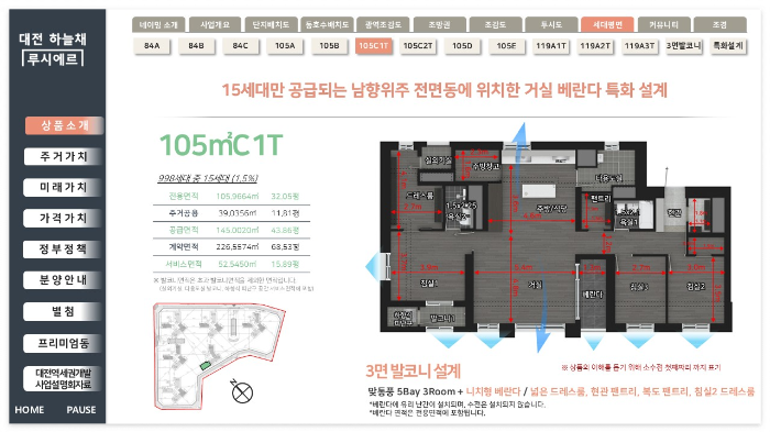 입지 측면에서 대전 하늘채 루시에르 2차를 살펴보면, 선화동에 조성 중인 약 4,700세대 초고층 주거단지 중에서도 가장 전면부에 자리잡고 있다는 게 핵심입니다. 후면 동이 아닌 선두 위치 덕분에 시야를 가리는 건물 없이 대전 시내 전체를 조망할 수 있다는 장점이 있죠. 49층이라는 높이에서 펼쳐지는 탁 트인 전망은 이 지역에서만 누릴 수 있는 프리미엄 요소라고 할 수 있습니다. 단지명인 루시에르는 대전 시민들이 직접 투표로 선정했는데, 스페인어로 빛나다라는 뜻의 Lucir와 창공을 의미하는 éter를 합친 이름이라고 하네요.