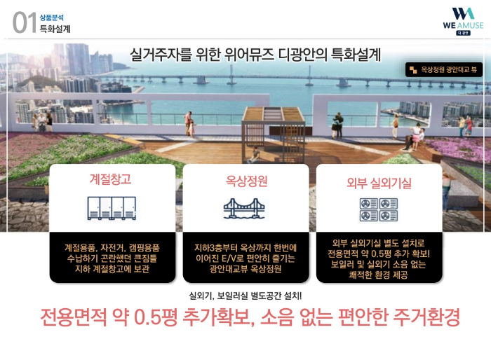 위어뮤즈 디광안의 옥상 설계도 차별화된 포인트입니다. 특정 층이나 특정 호실만 바다를 볼 수 있는 구조가 아니라, 모든 입주민이 공동으로 사용할 수 있는 옥상 공간에서 광안대교와 해변 경치를 감상할 수 있게 조성했습니다. 일과를 마치고 저녁에 올라가거나, 여유로운 주말에 올라가서 광안대교의 야간 조명쇼를 즐기는 건 거주자들에게 큰 만족감을 줄 것입니다. 매년 개최되는 광안리 불꽃축제를 최고의 각도에서 관람할 수 있다는 것도 특별한 장점이고요.