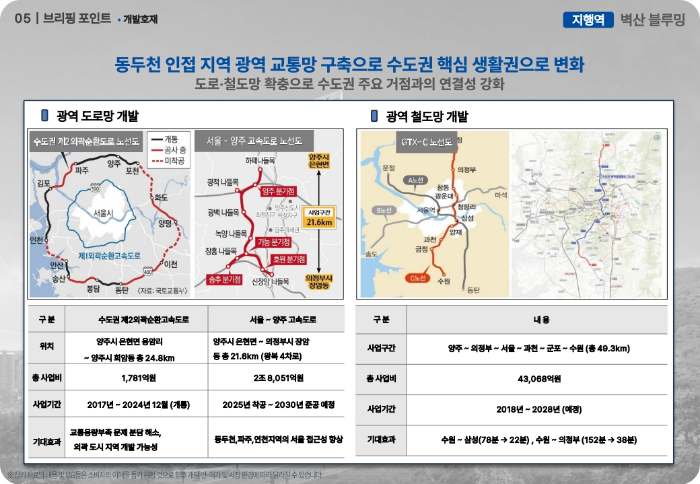 처음 동두천이라는 지역을 접했을 때는 솔직히 선입견이 있었습니다. 하지만 자료를 찾아보고 현황을 파악하면서 경기 북부 지역이 새로운 성장 중심지로 떠오르고 있다는 걸 알게 됐습니다. 특히 GTX-C 연장이나 국가산업단지 같은 건 단순히 계획 단계에 머물러 있는 게 아니라, 이미 예산이 투입되고 공사가 시작된 확실한 사업들입니다. 지금 시점에서는 다른 수도권 지역에 비해 상대적으로 저평가된 느낌이지만, 몇 년 뒤에는 경기 북부의 중심 주거지로 자리매김할 가능성이 충분해 보입니다. 부동산은 결국 미래 가치에 투자하는 거잖아요. 그런 관점에서 이 지역은 지금 눈여겨볼 만한 곳이라고 판단됩니다.