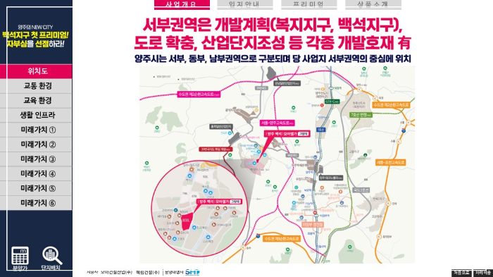 교통 여건도 좋습니다. 98번, 3번, 39번 국도가 인근에 있어 양주 중심부는 물론 의정부, 동두천, 서울 방향 모두 원활하게 연결됩니다. 양주 서부권 최초로 운행되는 백석-잠실 광역버스는 강남 직장인들에게 실질적인 출퇴근 대안이 되고 있습니다. 환승 과정 없이 강남 업무 지역까지 직접 연결되기 때문입니다.