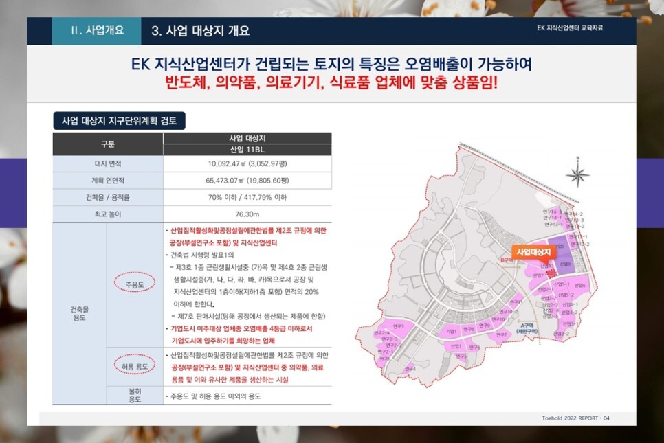 원주 EK 지식산업센터 현장 인근에는 산업단지들의 사무실 및 노후화 공장이 대거 이전할 것으로 예상하여 이로 인한 수요가 다수 존재할 것으로 예상하고 있습니다. 또한 인근에 있는 산업단지 종사자들의 수요에 비해서 주거 시설의 공급이 현저하게 부족한 상태에 해당하며 현장에 있는 기숙사와 라이브오피스의 수요가 다수 존재할 것으로 예상하며 기업도시 내 오피스텔 공실이 아직까지는 파악된 바가 없어 이번 신규 상품 역시 공실의 우려가 적을 것으로 예상하고 있습니다.